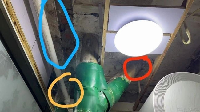 我家楼下,图中蓝黄两处渗水,去年楼上修过一次,修完有过一次漏水,然后不漏了,今年4月开始漏水,只要厕所用水量增大,漏水就严重,对方跟我强调是我们两家楼板间管线漏水。